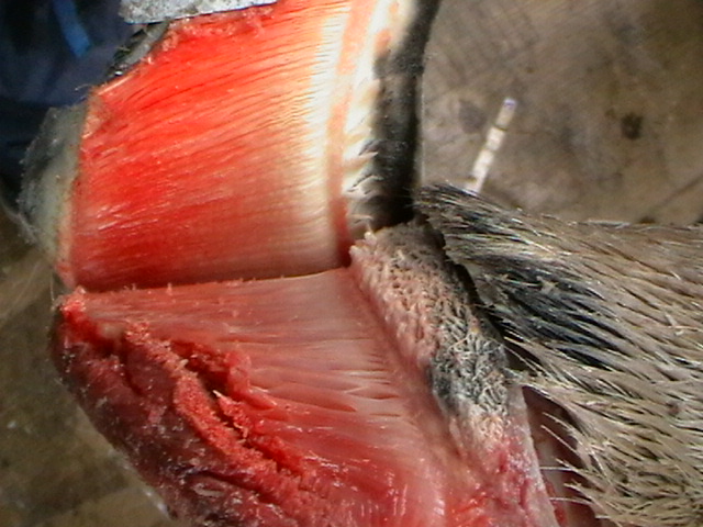 - Bilden nedan visar hur lamellerna fäster innanför hovväggen och på utsidan hovbenet genom att hovväggen är lösgjord och uppvikt.