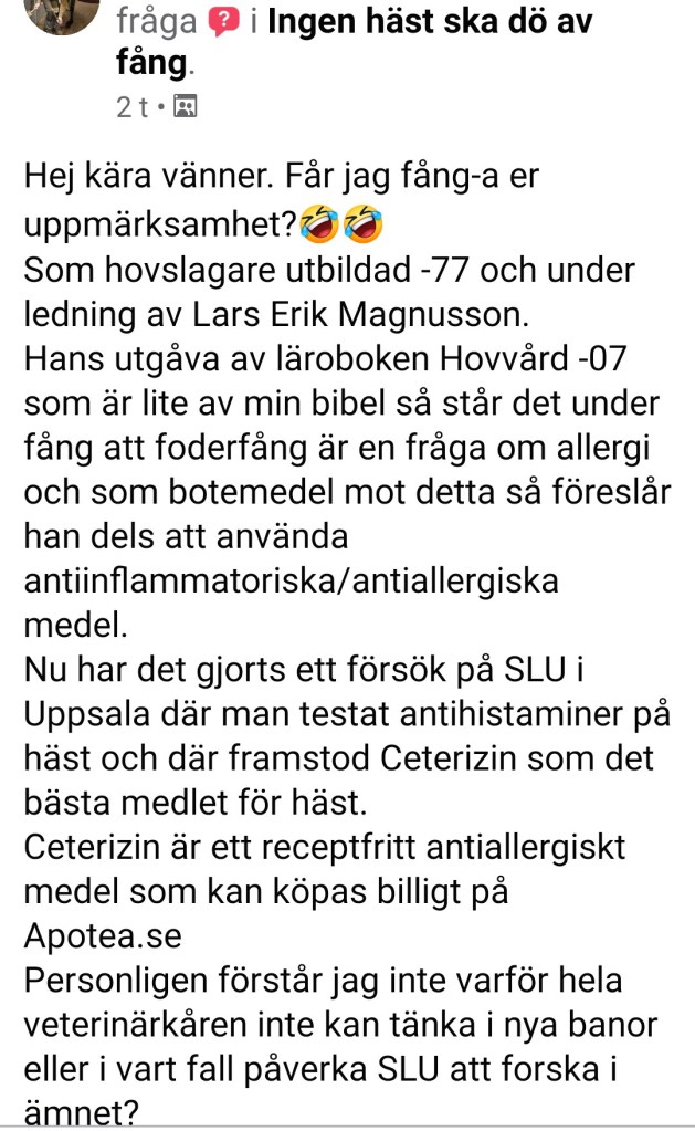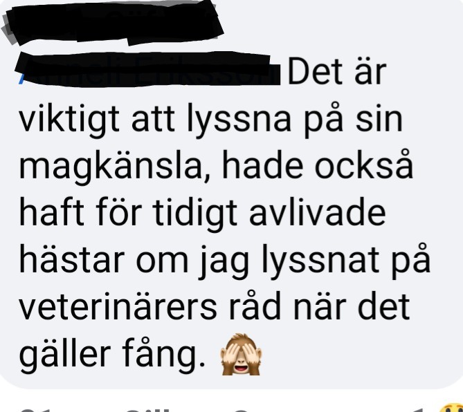 ~ Jag har haft en häst som fick avlivas pga fång tidigare, trots att jag tog hjälp av veterinärer, och har därför sett det som väldigt viktigt att försöka sätta mig in i de här sakerna och experimentera och lära mig på egen hand för att se vad som fungerar. Beprövade erfarenheter ligger oftast före vetenskapen på den här punkten, vilket betyder att ibland får man bättre och mer effektiva råd om man frågar en helt vanlig hästägare som har samlat egen kunskap och erfarenhet, än om man frågar en helt vanlig veterinär! När det gäller kunskapen om hur man förebygger fång så är det ofta så.