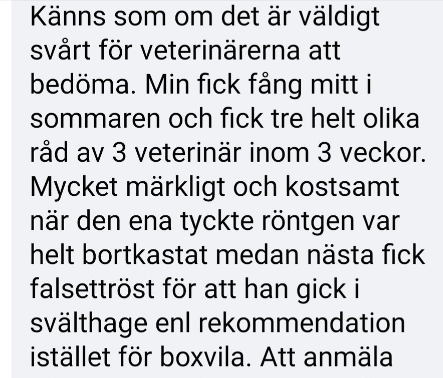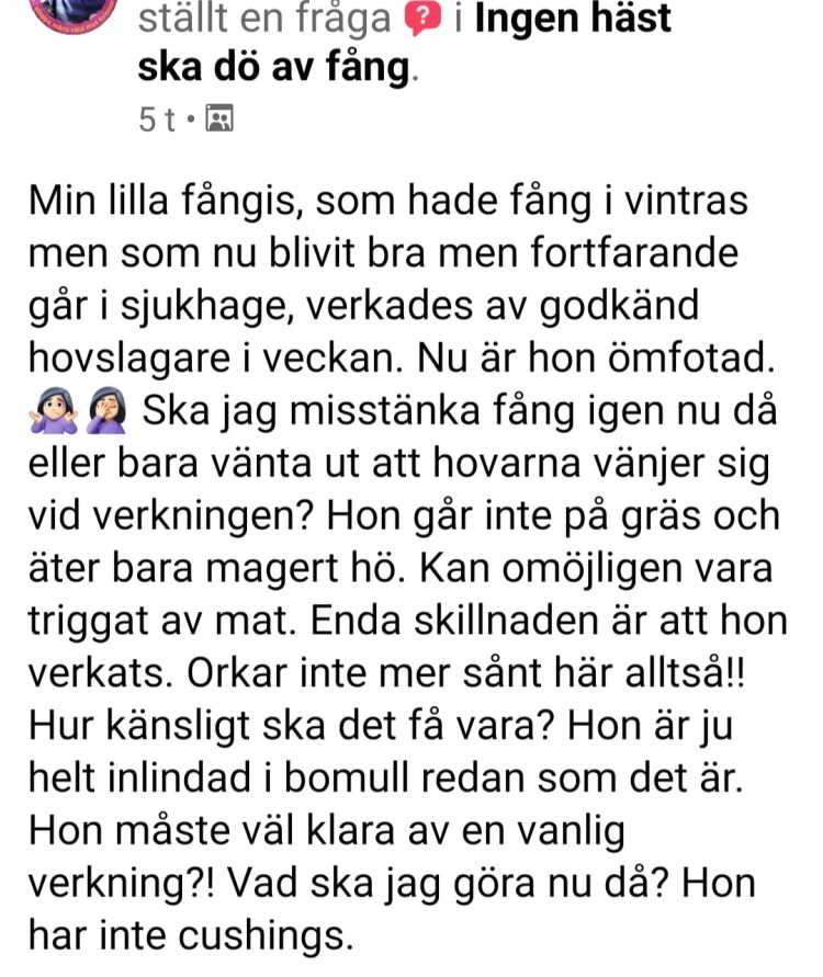| Om hästen är nyskodd eller skodd med sula, ta om möjligt av skorna. Gör inga andra förändringar på hovarna i det akuta skedet. /Evidensia | Om hästen är nyskodd eller skodd med sula, ta av skorna!!! Gör en fångverkning. (avlasta hovväggarna). Om man verkar omedelbart kan man helt förhindra att hovväggen tänjs loss /att “hovbensrotation” uppkommer. Du måste inte enligt lagen använda en Godkänd hovslagare vid akut fång, du har rätt att åtgärda akut lidande om det anses ta “för lång tid” innan veterinär eller utbildad hovvårdare kommer. Vid lättare känningar går även hovformvårdare bra. Vart nivån går däremellan är lite oklart. Hitta dem på fliken hovvårdare. |