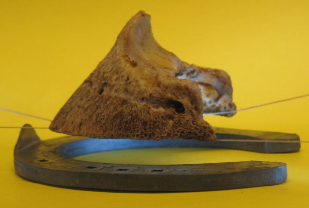 | På grund av böjsenornas dragkraft på hovbenet, då benet belastas med vikt, kan hovbenet sjunka. Så kallad : HOVBENSSÄNKNING Detta mäts på röntgenbilder i grader av rotation. | Hovbenet kan inte röra sig på det sättet. Med fel verkning av hovkapseln skapas den “hovbenssänkning” man ser på röntgen på grund av tänjning av hovkapseln uppåt. Detta händer om hoven blir för hög och lång. |