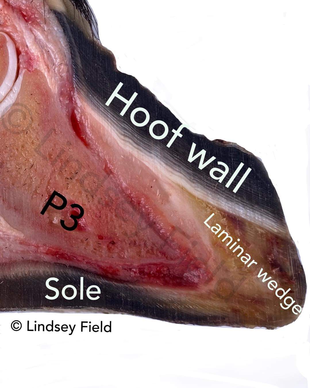 - Bilden nedan visar hur lamellerna fäster innanför hovväggen och på utsidan hovbenet genom att hovväggen är lösgjord och uppvikt.