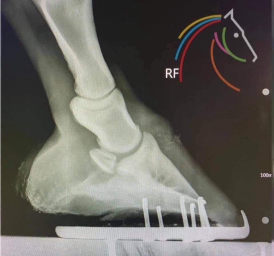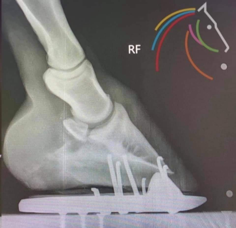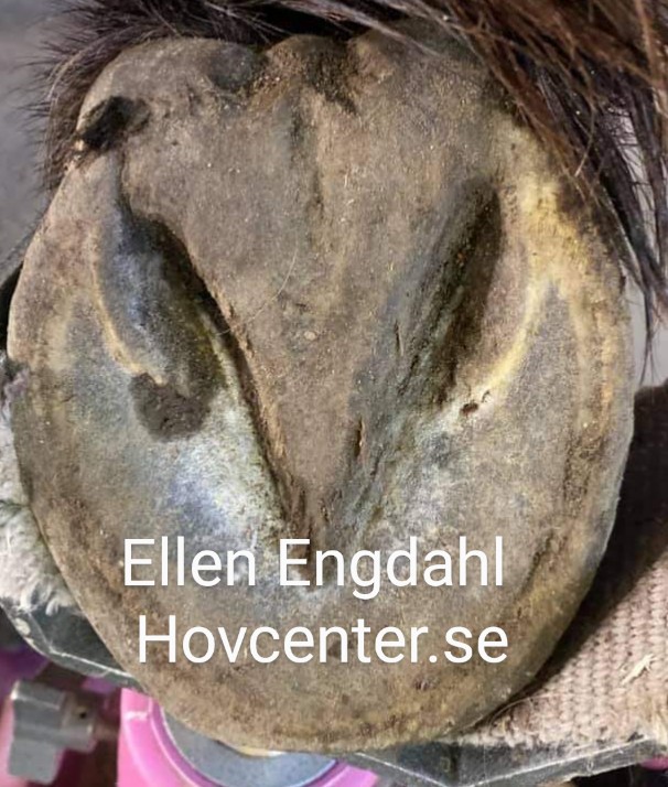 BILD 1. Hoven var från början skodd med en vanlig järnsko, öppen baktill, alltså utan något stöd för det stötdämpande området bak i hoven.