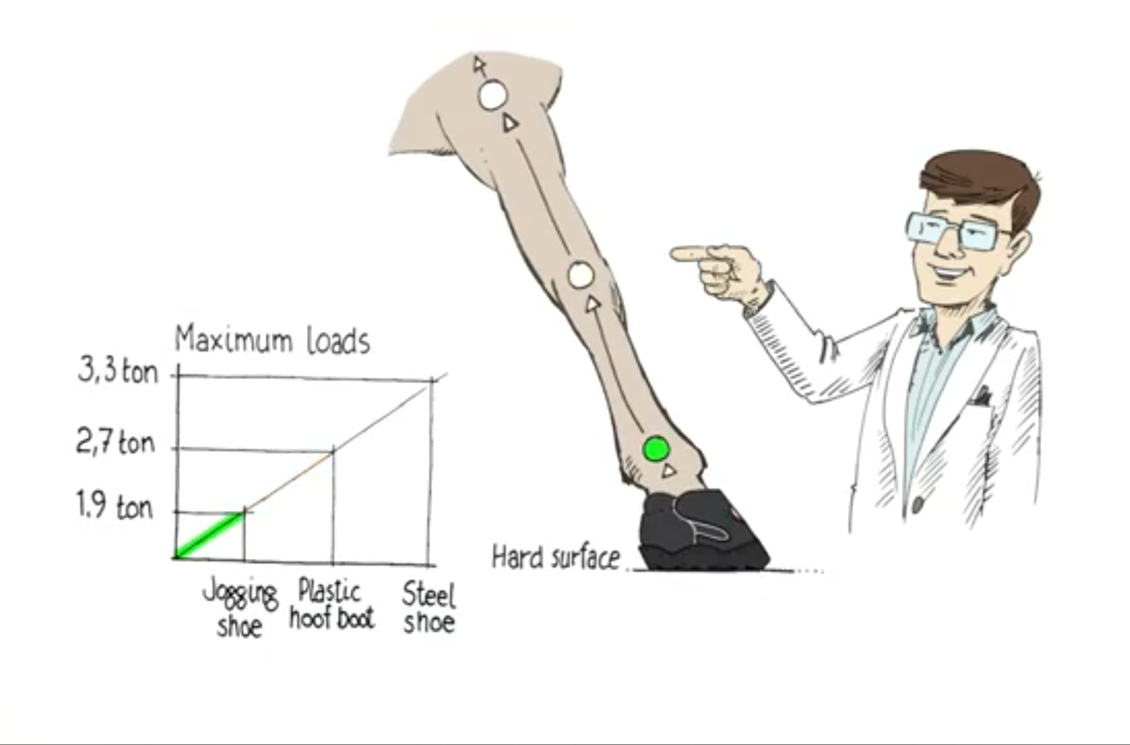 Vid en mätning av kraften i nedslaget ses tydligt hur mycket xtra belastning järnskor ger på leden i jämförelse med att ha mjuka skor. Från 1,9 ton till 3,3 ton!