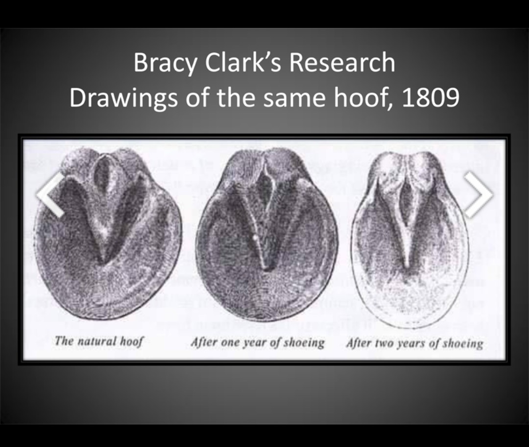 Ovanstående citat kan bero på att forskning visar att hoven fungerar allra bäst HELT UTAN skor. Elastiska putan, trampdynan, böjsenan och även hovkapseln tar upp stötdämpningen i hoven genom att de är mycket elastiska och rörliga. Det kallas hovmekanism.