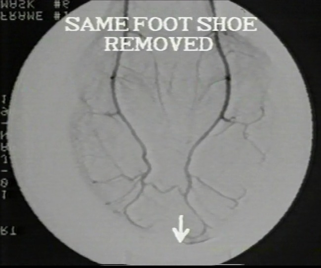 Nedan till vänster ses blodtillförseln i en hov med järnsko på och sedan samma hov till höger efter att järnskon tagits av.