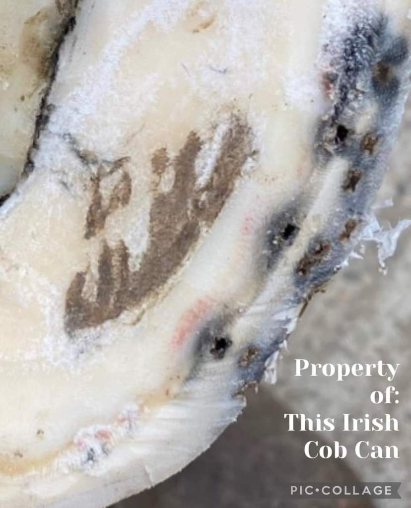Nedan ser du bild på en häst med tre oskodda röda hovar och en precis avskodd hov, den gröna.
